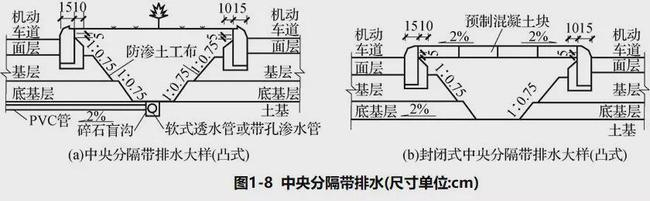 中央分隔带的排水设施由排水沟(明沟、暗沟)、渗沟、雨水井、集水井、横向排水管等组成。中央分隔带可采用凸式(见图1-8)、平式或凹式,一般不封闭,但也可封闭。