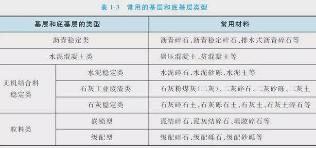 修筑基层和底基层的材料主要有各种结合料(如石灰、水泥、沥青等)稳定土或稳定碎(砾)石、贫水泥混凝土、天然砂砾、碎石、砾石、片石、块石,各种工业废渣(如煤渣、粉煤灰、矿渣、石灰渣等)和土、砂、石所组成的混合料等。常用的基层和底基层类型见表1-3。