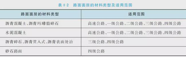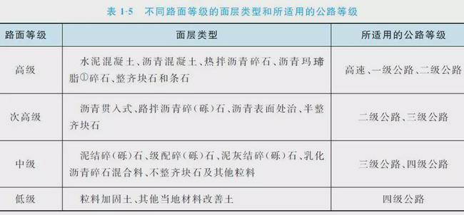 路面等级分为高级、次高级、中级和低级,不同路面等级的面层类型和所适用的公路等级见表1-5。