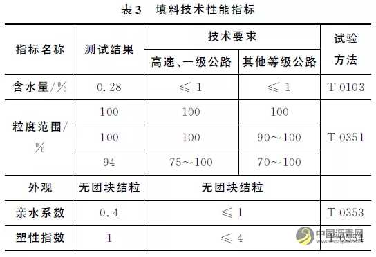 水性环氧改性乳化沥青微表处制备的主要原材料包括水性环氧改性乳化沥青、集料、填料、水。其中,水性环氧改性乳化沥青为自制;集料选用优质玄武岩,具有优良的抗压、耐磨耗及抗冲击性能;填料由矿粉、水泥组成,可起到改善矿料级配和工作特性的作用;试验用水为饮用水。根据《微表处和稀浆封层技术指南》(TJG/T F40-02-2005)(以下简称《指南》)相关规定,对主要原材料进行性能测试,结果见表1~3。