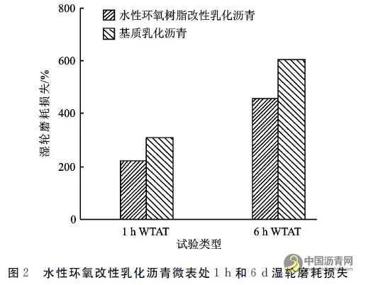 微表处运营后将长期经受车轮磨耗以及雨水等的侵蚀,故研究水性环氧改性乳化沥青微表处的耐磨耗性能和抗水损坏性能具有重要意义。参考《指南》,采用1h湿轮磨耗损失和6d湿轮磨耗损失分别评价水性环氧改性乳化沥青微表处的耐磨耗性能和抗水损坏性能,结果见图2。