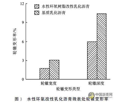 由图3可知,水性环氧树脂的加入能够提升乳化沥青微表处的抗车辙能力,相比于普通乳化沥青微表处,水性环氧改性乳化沥青微表处轮辙变形率明显降低,其中轮辙宽度和深度变形率分别降低43.55%和42.24%。分析认为,这是由于水性环氧树脂在乳化沥青中与固化剂发生反应后,生成了具有三维网状结构的固化产物,这种固化产物与破乳后的沥青呈相互穿插状,并与集料紧密地黏结在一起,因此微表处的强度明显增强,抗车辙性能得到显著改善。