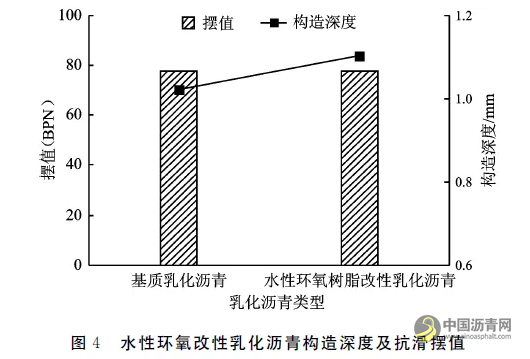 水性环氧改性乳化沥青微表处应具有良好的抗滑性能,以保障行车安全性,参考《公路工程沥青及沥青混合料试验规程》(JTG E2-2011),采用构造深度和抗滑摆值评价微表处的抗滑性能,试验结果见图4。