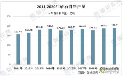 我国砂石骨料仍处于产需两旺的阶段,未来较长的时间内产量或都将处于高位运行。但我国砂石行业作为一个长时间以传统粗放模式发展的行业,随着环保督察执行力度的上升,受到严重冲击,相关企业出现了大面积的限产停产、关停退出,致使各地砂石价格急速攀升,对下游行业造成了严重冲击。具体来看,受环保督察影响,2018年部分砂石企业关停,当年产量同比2017年下降3.4%;2019年国内的砂石产量有所回升,约188.1亿吨。2020年国内砂石骨料的产量为190.7亿吨。近几年我国砂石骨料产量如下: