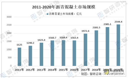 据统计,2011年中国沥青混凝土行业市场规模为1125亿元,2020年沥青混凝土行业市场规模为2544.4亿元,年复合增长率为9.49%。