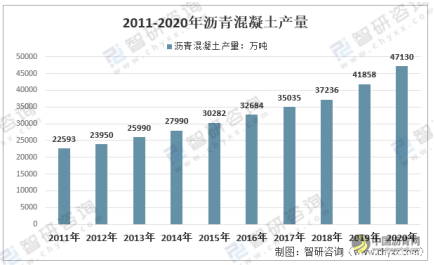 近几年,我国沥青混凝土行业产量快速增长,从2011年的22593万吨增长到了2020年的47130万吨。如下图所示: