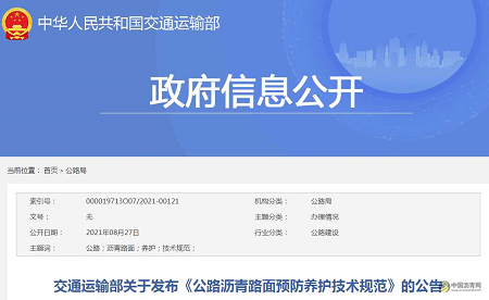现发布《公路沥青路面预防养护技术规范》(JTG/T 5142-01—2021),作为公路工程行业推荐性标准,自2021年12月1日起施行。
