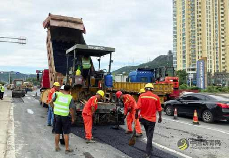 9月16日上午10时许,记者来到施工现场,正在施工中的右车道已被封闭,路面上有三四处前期铣刨机修复车辙病害后留下的长形空槽。摊铺机正将沥青均匀地摊铺在空槽上,四名养护工人紧跟其后,用铲子将沥青铺平沥青网sinoasphalt.com。随后双钢轮压路机和皮轮压路机先后上阵,对新铺的沥青路面进行压实。