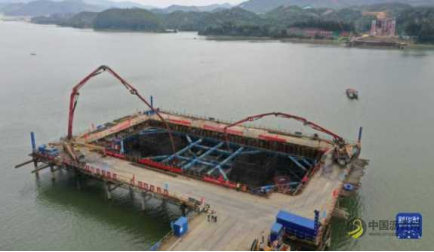 当日,在广西上林至横州高速公路建设施工现场,工人们加班加点完成控制性工程——西津郁江特大桥水中承台的浇筑作业。