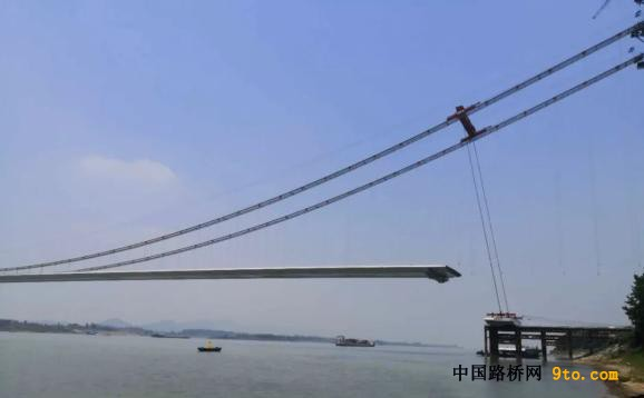 如果说主塔施工是有“根”的高空历险,钢箱梁的吊装就是一次次悬空的历险。在设计中,大桥有6片钢箱梁在非通航区,架设不能船运直接垂直提升,建设者们采用荡移法,岸上提前搭设移梁支架平台,钢箱梁通过船运提升到移梁支架高度,通过卷扬机水平牵引荡移到移梁支架平台,钢箱梁就像在荡秋千,再牵引到对应吊装位置,二次提升吊装钢箱梁到位。