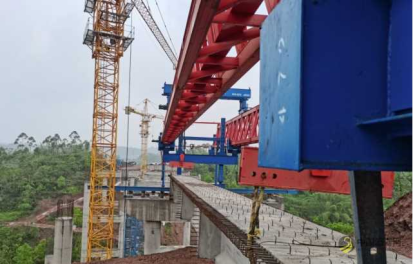 此次首片T梁架设成功的土地磅大桥,全长157米,下部结构桥台采用U型桩柱式轻型桥台,桥墩采用柱式墩,上部结构采用预应力砼T梁。桥梁跨越河谷深邃地区 ,纵向地貌起伏大,施工难度高,对T梁架设的精确度掌控更为严格。