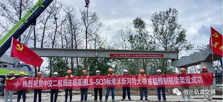 10月11日,宿连高速公路沭阳至宿豫段工程淮沭新河特大桥首片30米预制箱梁完成架设。宿连高速公路宿豫至沭阳段工程路线全长约47.668千米,项目全线采用双向四车道高速公路标准建设,设计速度120千米每小时,路基宽27米。其中淮沭新河特大桥全长2080.2米,为全线控制性工程,所需预制箱梁368片。首片预制箱梁长30米、宽2.85米、高1.6米、总重量91.52吨,采用200吨和300吨汽车吊各1台进行安装。