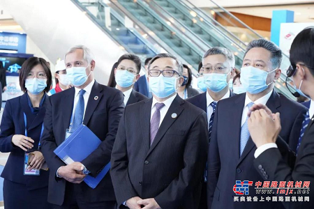 交通运输部部长、党组副书记李小鹏,联合国副秘书长刘振民,联合国驻华联络员常启德,交通部副部长戴东昌一行莅临徐工展区参观