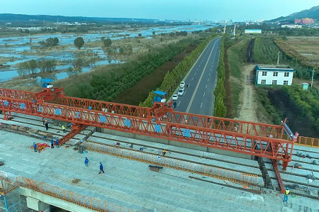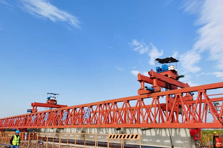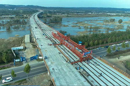 洛河特大桥位于河南省洛阳市宜阳县柳泉镇元村附近,以分离式桥梁形式上跨洛河,桥梁全长1307.1米,属于“3隧32桥”控制及重难点工程。该桥横跨洛河,涉及河道内水中墩施工,水流量较大,且跨315省道,车流量大,因此施工难度大。项目部积极主动与宜阳县交通局沟通协调,从限高架安装、交通封闭、导流等方面进行周密部署,实时全方位优化施工方案,并邀请专家评审,对施工方案进行细化完善,严格按照方案组织施工。项目部在河道内修建施工便道,在水中墩施工范围内修建施工平台,针对钻孔桩渗水量大的问题,采用调制好的化学泥浆注入桩内,有效防止了桩孔坍塌。施工过程中,技术人员及安全人员全程盯控、指导,使作业过程平稳、同步、安全。项目部及时协调解决施工难题,多措并举,畅通架梁通道,严格技术和安全交底,在确保安全和质量的基础上,快速高效推进项目建设。