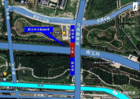 马家堡西路南延纵穿大兴区、丰台区,位于经开高速以东、团河路以西。是北京市南部区域重要的南北方向交通通道。马家堡西路南延跨五环慢行系统位于马家堡西路南延段与南五环交界处,天桥全长478米,其中钢结构长264米。跨五环部分为一联三跨(跨径为21米+42米+24米),天桥路面净宽6米,箱梁吊装时需要当日0时至5时,断行五环主路施工。