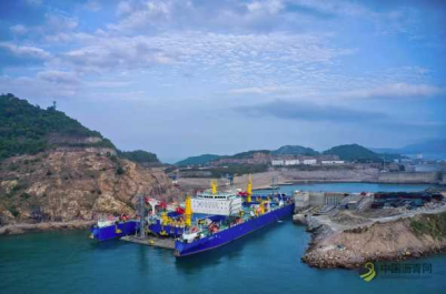 沉管运安一体船提带E18管节从沉管智能制造厂出发。