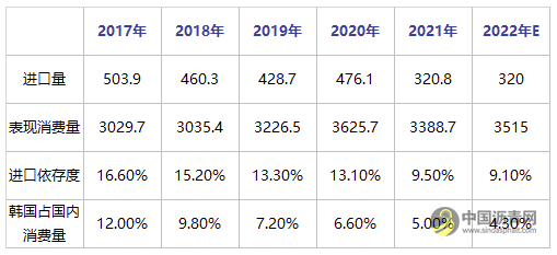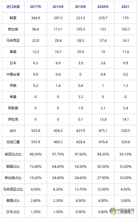 韩国是中国沥青产品第一大进口国,主要来源为韩国GS和双龙企业,从2019-2021年数量明显减少。