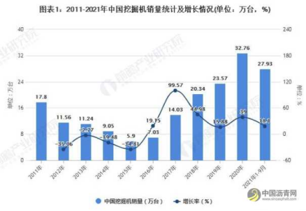 根据中国工程机械工业协会行业统计数据,2021年-9月纳入统计的25家主机制造企业,共计销售各类挖掘机械产品279338台,同比增长18.1%。其中国内市场销量232312台,同比增长9.2%;出口销量47026台,同比增长98.5%。