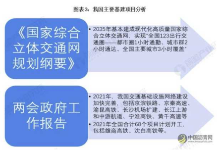 未来,我国会持续加大交通基础建设。在《国家综合立体交通网规划纲要》中提到,到2035年建成现代化高质量综合立体交通网,实现全国123出行交通圈。在两会工作报告中,也针对2021年交通基础设施建设项目做出了目标性的规划。