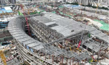 近日,粤港澳大湾区重点交通基础设施项目广州白云站完成了约4000吨的钢结构花瓣拼装工程节点,“云山珠水,木棉花开”的外观雏形正式显现。