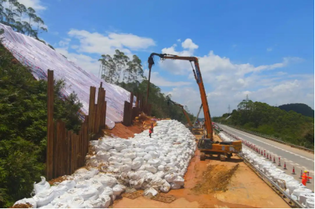 7月7日发生险情后,二广高速全力开展抢险保通作业,于7月8日解除边坡塌方路段往广州方向交通管制后,继续昼夜不停地开展塌方边坡临时加固处治工作。