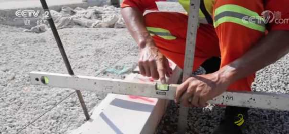 刚打完桩,班组成员又马不停蹄拉钢丝标线,老罗负责核查标线是否处在同一水平线。太阳直射下,钢筋桩十分烫手,但为了把误差控制在1毫米以内,老罗脱掉手套,徒手测量捆绑。不一会儿,双手就变得通红。