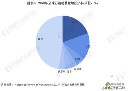 从区域结构来看,2020年石油消费量TOP10国家分别为美国,中国,印度,阿联酋,俄罗斯,日本等。美国是最大石油资源消费国,2020年占全球石油消费量的19.41%。