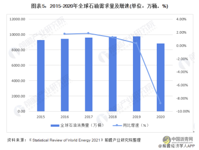 根据《BP世界能源统计年鉴2021》数据,2015-2020年,全球石油消费量总体呈现增长趋势。2019年,全球石油消费量为9759.8万桶,同比上升0.34%。2020年受疫情影响,全球石油需求出现大幅下滑,2020年同比下滑3.8%,至8847.7万桶。