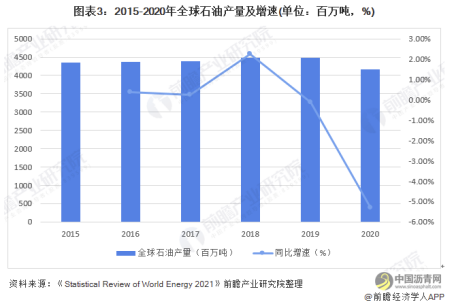 根据《BP世界能源统计年鉴2021》数据,2015-2020年,全球石油产量总体呈现下降趋势。2019年,全球石油产量为44.78亿吨,同比下降了0.14%。2020年全球石油产量较2019年下降5.3%,至41.65亿吨。