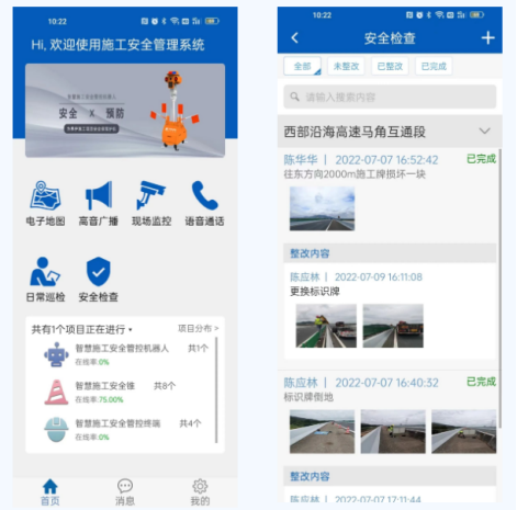 养护“机器人”投入使用后,可以常驻在施工周期长的施工点位,如涉及路面重大施工工程等。同时巡查人员可以通过手机APP软件实时查看施工现场情况,施工过程中发现的交安设施及违规行为及时上传至手机APP形成整改项推送至施工现场负责人进行整改并上传到手机APP,有效的发现施工问题,形成闭环环节,以云技术为核心APP应用,随时随地对现场进行检查、指导,提升各部门综合管理协同效率,同时有效的遏制施工区域的作业风险。