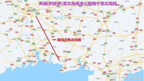 天峨(黔桂界)至北海高速公路南宁至北海段起点位于南宁市邕宁区州同村与规划南宁二环高速相交,途经钦州市新棠镇、长滩镇、小董镇、平吉镇、那彭镇、那思镇、长滩镇、平吉镇、那彭镇,终点位于北海市合浦县沙岗镇南侧三东村接滨海一级路,路线全长约145公里。
