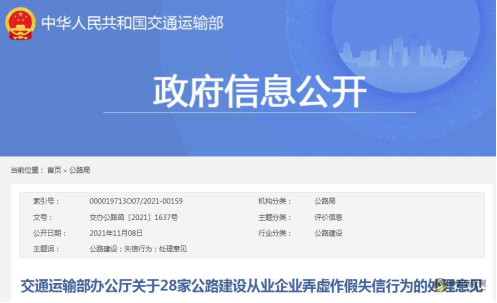 近期,我部在开展相关工作时发现28家公路建设从业企业涉嫌弄虚作假,经向相关省级交通运输主管部门和企业核实,上述28家企业弄虚作假失信行为属实。根据有关规定,处理意见如下。