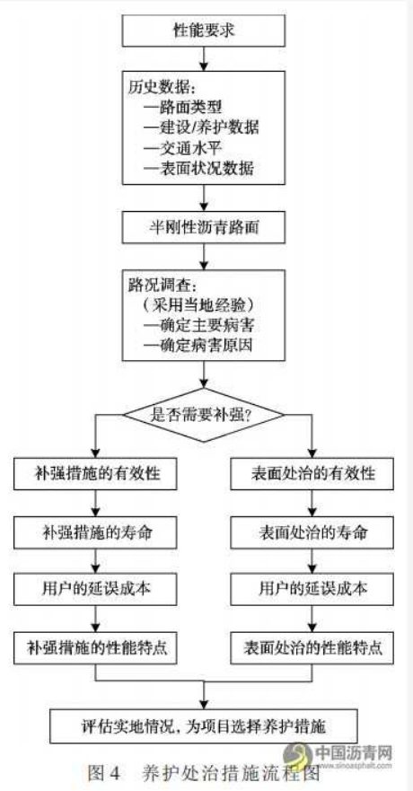 路面表层及时养护是确保长寿命路面路用性能的重要条件。通过对每个路表状况指标的连续监测和分析,可以改进养护的有效性。COST ACTIVE 343(FEHRL,2003)开发了一个流程图(见图 4),为特定的项目选择最合适的路面养护措施,并使选定的养护方案具有可行性和可操作性;同时最大限度地减少对交通的干扰。