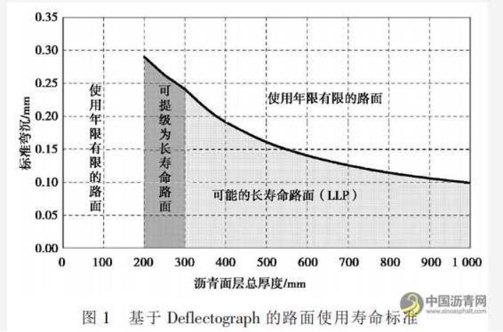 欧洲的网级评价是基于路面管理系统建立的,例如英国的公路路网,其所有的调查数据都以电子资料形式存储到公路局路面管理系统(HAPMS)中。所有路面类型均须对功能性指标,如抗滑能力和路表质量状况进行检测和评价。在网级层面,半刚性路面结构的评价可用弯沉指标来测量。然而,长寿命路面的关键特征之一是其结构性能不随时间减弱,因此,重交通路段半刚性基层路面的弯沉应逐年连续观测,以记录路面的弯沉历史。长寿命半刚性沥青路面的一个重要指标是弯沉不随时间的增加而增加,路表状况的检测可用来支持这一趋势。英国根据每百米长度内轮迹带最大弯沉的第 85 分位值和面层厚度,建立了柔性基层沥青路面使用寿命标准(见图 1):沥青层总厚度应大于 30 cm,且标准弯沉小于 0.1~0.2 mm,即可认为是可能的长寿命路面[14]。