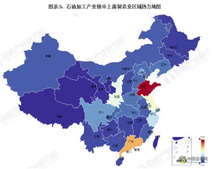 中国石油加工产业链区域热力图:山东炼化企业密度最高