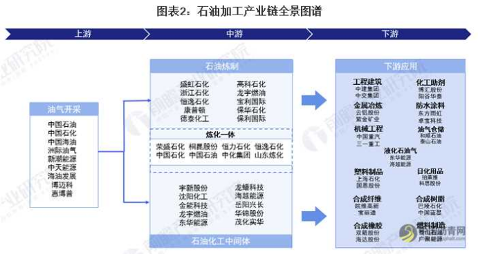 石油加工产业上游的油气开采为中游提供原料基础,中游的石油加工是产业链的关键。其加工方式可分为石油炼制和石油化工,石油炼制以原油为基础进行深加工以制造成品油;