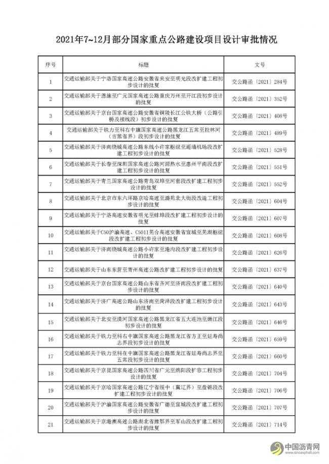 2021年7~12月部分国家重点公路建设项目设计审批情况
